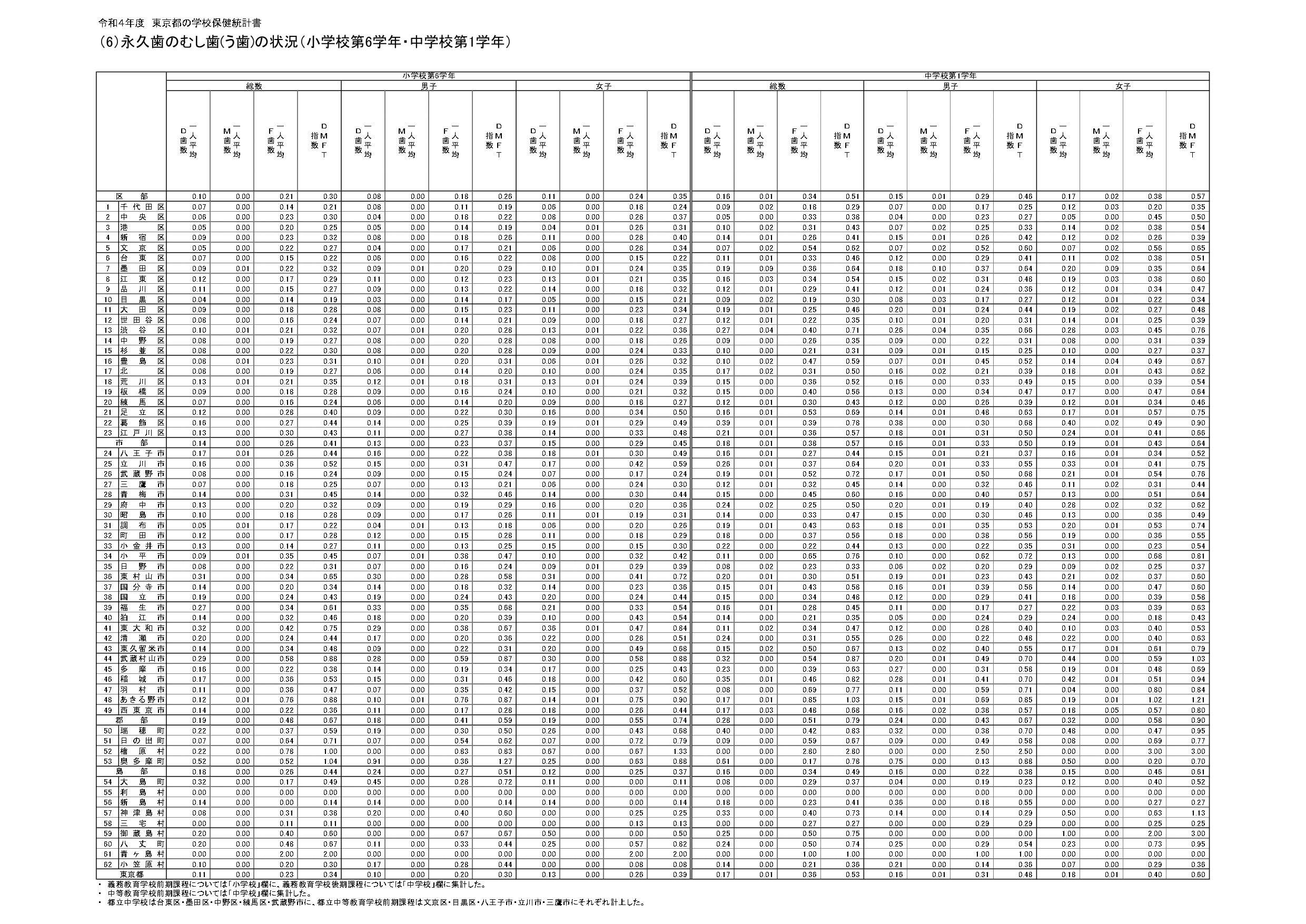 令和4年度東京都の学校保健統計書|永久歯のむし歯(う歯)の状況(小学校第6学年・中学校第1学年)